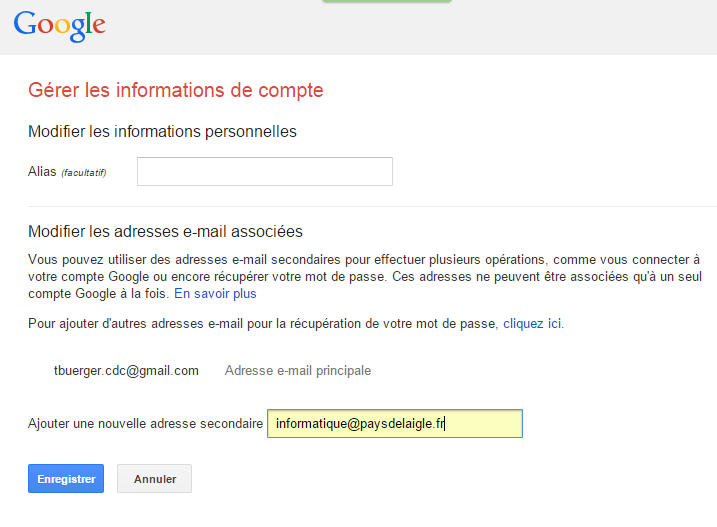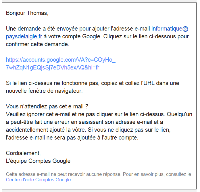 qui renvoient les émails vers l'adresse Gmail ou vers une adresse Orange. Ceci pose un problème lors d'une invitation à un événement dans laquelle l'adresse « paysdelaigle.fr » a été utilisée pour inviter au lieu de l'adresse Gmail ou Orange : On ne peut pas inclure dans l'agenda l'invitation par un simple clic sur le lien d'acceptation – Ceci est refusé par Google.